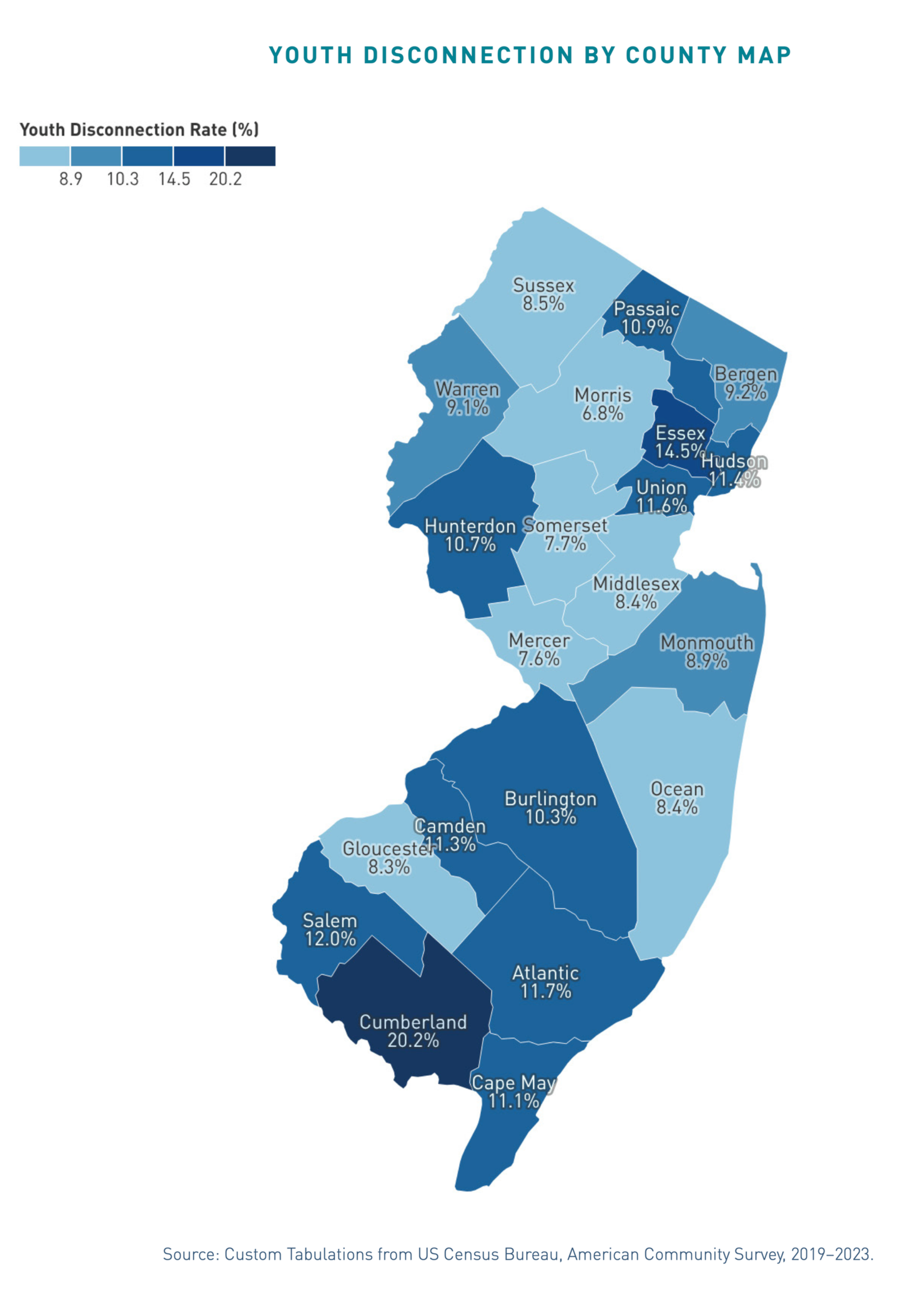 Youth disconnection is not concentrated in one place or one community. Across New Jersey, elevated rates appear in every county and among every racial and ethnic group. Rural Cumberland County has the highest per capita rate in the state, with 20.2% of young people ages 16 to 24 neither in school nor working. Essex County follows at 14.5%, with 14,400 young people left without a path forward.